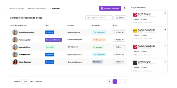 Vagas, candidatos, interações e status de cada processo — tudo em um painel fácil de usar e pronto para sua equipe.