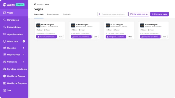 A rede de especialistas da uWorky analisa sua vaga e indica os melhores candidatos com base no perfil e nas exigências da posição.